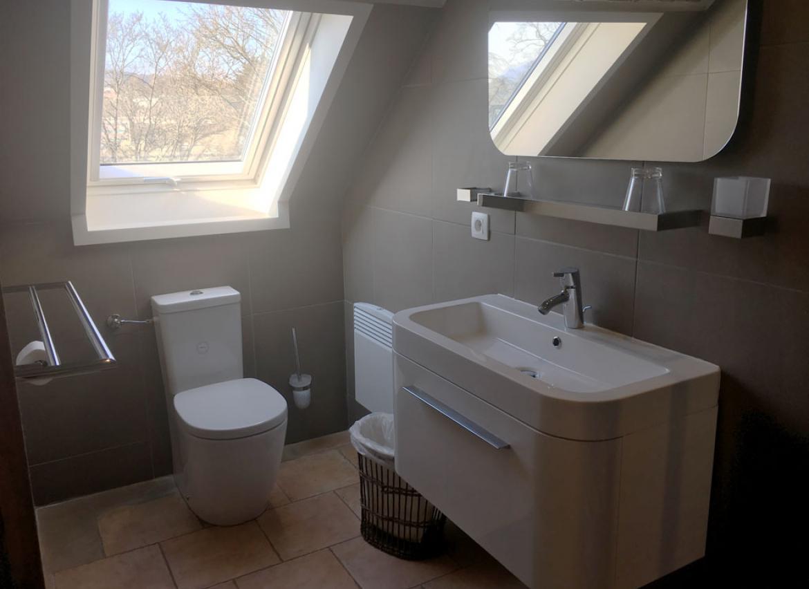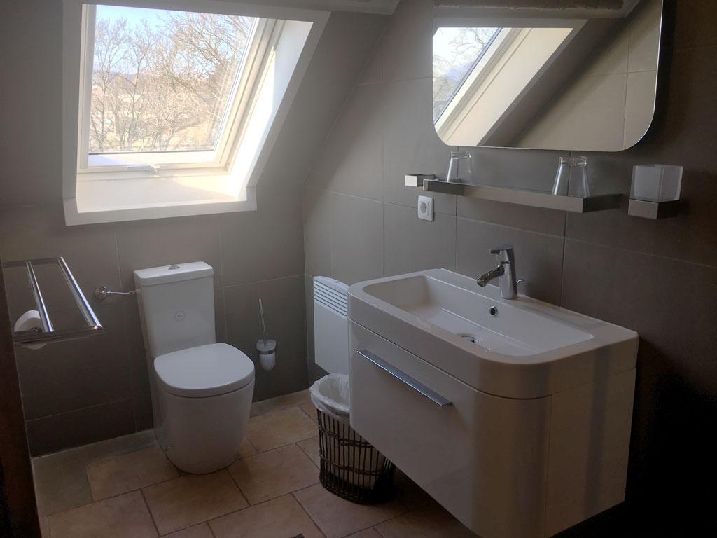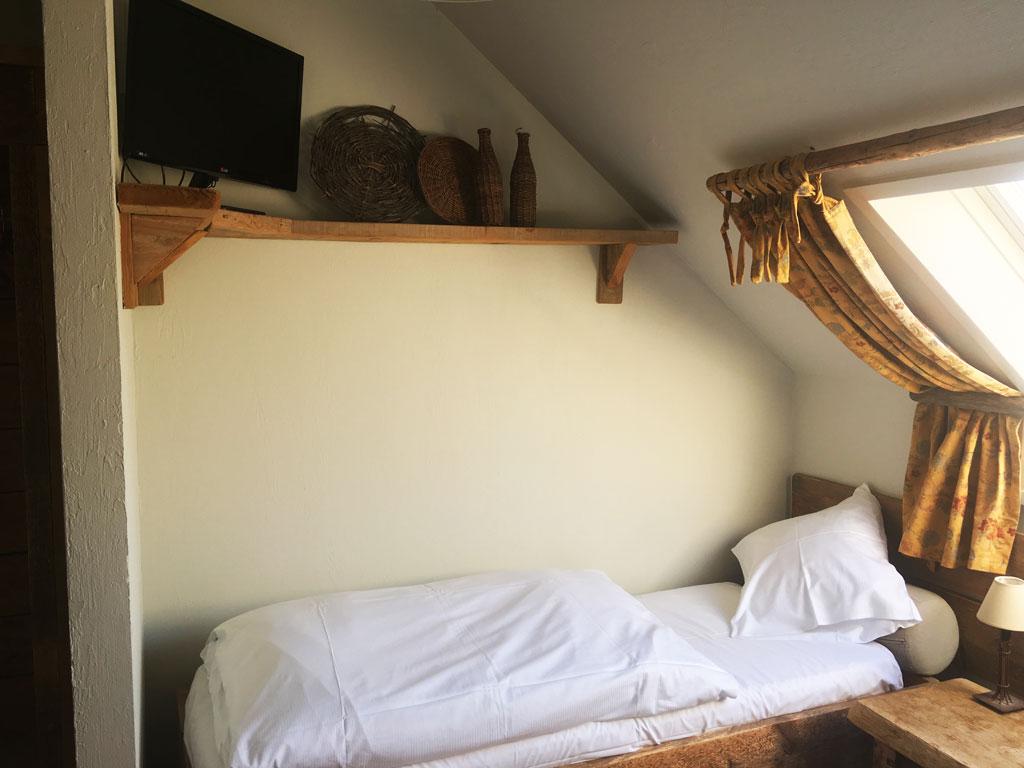 • 1 chambre : 3 personnes en lit double et « simple », TV, salle de bain privative avec baignoire + lavabo + WC